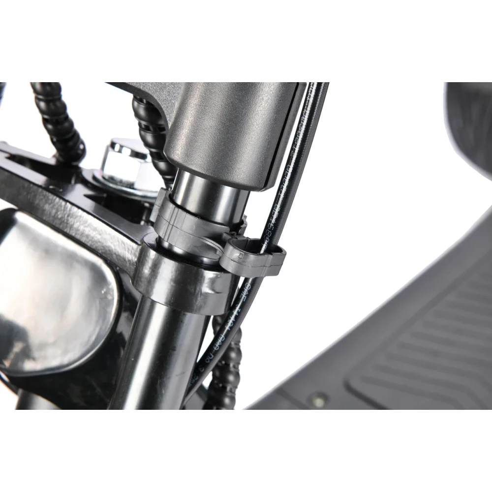 Конструкция выдерживает до 200 кг за счет прочного материала и широкой подножки. Быстро тормозит на любой дороге из-за задних гидравлических и передних дисковых тормозов. Система амортизации усилена по сравнению с прошлыми моделями этой серии. Поэтому дорога становится более комфортной.