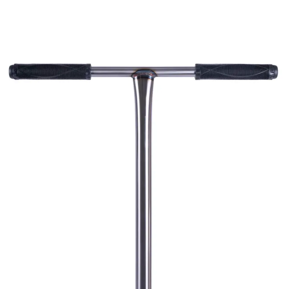 Особое внимание уделено конструкции руля: он выполнен из высокопрочной стали, имеет внешний диаметр 34,9 мм, высоту 615 мм и ширину 540 мм, что гарантирует уверенное сцепление и удобство в эксплуатации. Вилка самоката изготовлена из алюминия и оснащена системой компрессии HIC, обеспечивающей эффективное гашение ударов при приземлении. Надежная дека, также выполненная из алюминия, обладает интегрированным типом рулевой, шириной 140 мм и длиной 490 мм, а футспейс в 340 мм позволяет правильно распределить нагрузку, что особенно важно для уверенного контроля при выполнении сложных элементов.